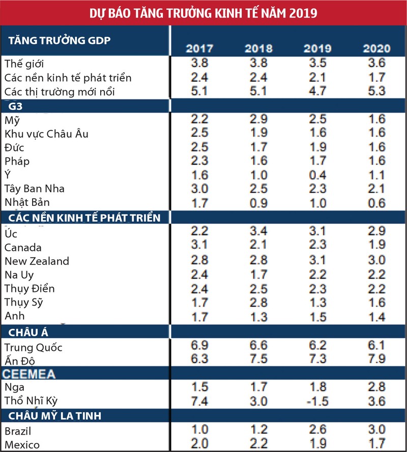 Khi năm 2018 dần khép lại, dường như đây là một chương khá tích cực của nền kinh tế toàn cầu. Tăng trưởng GDP thực đạt 3,8%, cao hơn nhiều so với những chỉ dấu xuất hiện vào đầu năm. Tuy nhiên, những ngày tăng trưởng tích cực dường như đã ở lại phía sau, tăng trưởng GDP toàn cầu dự báo sẽ đạt 3,5% vào năm 2019, với đà giảm tốc của các nền kinh tế mới nổi, đặc biệt là Trung Quốc.