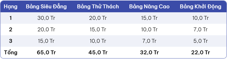 💰 GIẢI CHUNG CUỘC (Tổng 164 triệu VNĐ): Vinh danh những anh tài dẫn đầu đường đua với giá trị giải thưởng lên đến 30.000.000 VNĐ/giải.