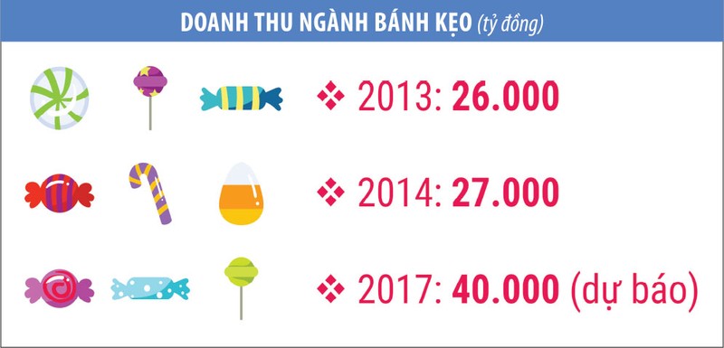 Theo kết quả nghiên cứu của BMI, doanh thu ngành bánh kẹo Việt năm 2014 là hơn 27.000 tỷ đồng và dự báo đến năm 2018 sẽ đạt khoảng 40.000 tỷ đồng, tương đương 1,76 tỷ USD. Để phân chia miếng bánh “khủng” này, các doanh nghiệp nội và ngoại liên tục đưa ra những sản phẩm mới cùng chiến lược cạnh tranh mạnh mẽ.