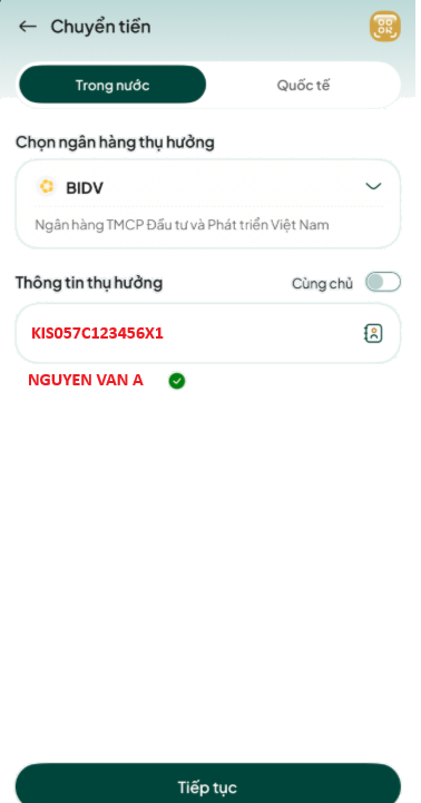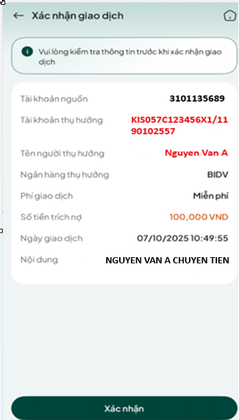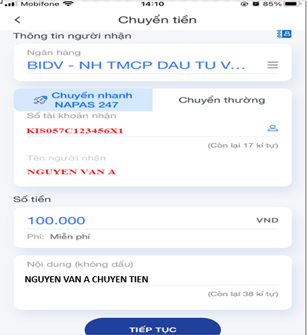 Để nộp tiền vào Tài khoản giao dịch chứng khoán tại KISVN tự động nhanh chóng, Quý khách có thể nộp tiền thông qua Tài khoản định danh của KISVN mở tại Ngân hàng BIDV theo hướng dẫn sau: