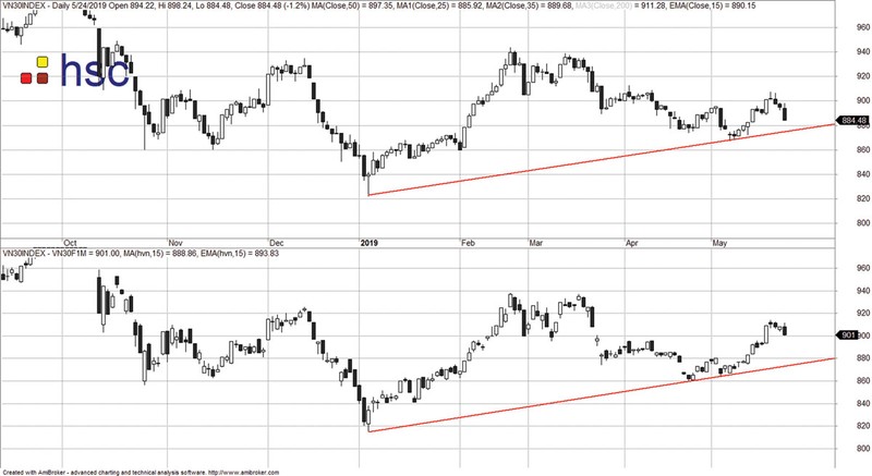 Các chỉ số đang trong quá trình tiếp cận vùng hỗ trợ mạnh quanh 880 điểm trên VN30 và 890 – 895 điểm trên VN30F1906, nhưng xu hướng tăng của chỉ số chưa có dấu hiệu kết thúc. Do đó, chiến lược canh mua (Long) quanh vùng hỗ trợ vẫn được đánh giá cao. Ðiểm yếu cho vị thế mua vào lúc này là độ lệch giữa phái sinh và cơ sở quá lớn (+16,5 điểm), khiến việc tham gia vị thế mua trở nên bất lợi. Ðể hạn chế rủi ro, nhà đầu tư nên canh thời điểm tham gia khi độ lệch thu hẹp còn khoảng 10 – 12 điểm. Trong khi đó, vị thế bán (Short) nên được cân nhắc nếu các mốc hỗ trợ bị phá vỡ, tương ứng với vùng 890 điểm trên VN30F1906.