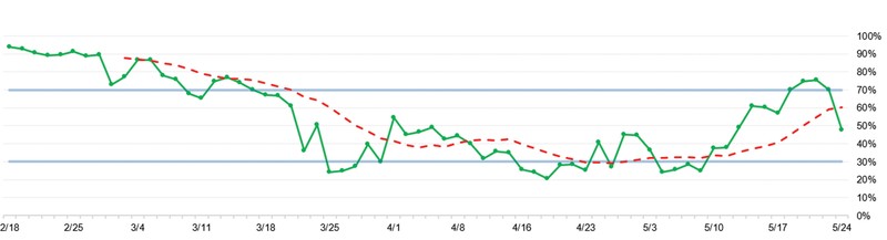 Ðà lan tỏa chưa quay trở lại đỉnh cũ thì đã quay đầu giảm, thậm chí gãy đường trung bình 10 phiên gần nhất, cho thấy mức độ lan tỏa ở các cổ phiếu trụ khá kém, nhịp tăng lần này thiếu sự đồng thuận của các nhóm dẫn dắt. Xét về xu hướng chung, đà lan tỏa vẫn chưa quá xấu. Tuy nhiên, nếu không có những nhịp kiểm tra thành công vùng MA10 trong đầu tuần này (27 – 31/5) và tiếp tục nhịp suy giảm, thì nhịp tăng của thị trường có thể sẽ kết thúc.