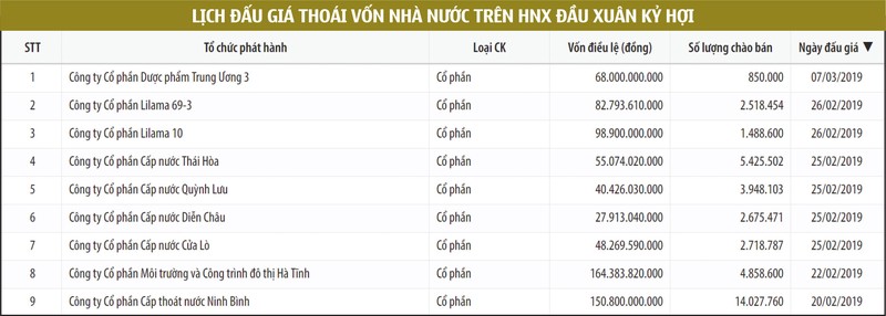 Tại HNX, lịch đấu giá cho 9 phiên đấu giá đầu năm đã được sắp xếp. Phiên đấu giá “mở hàng” năm mới Kỷ Hợi là đợt thoái vốn của UBND tỉnh Ninh Bình tại CTCP Cấp thoát nước Ninh Bình.
