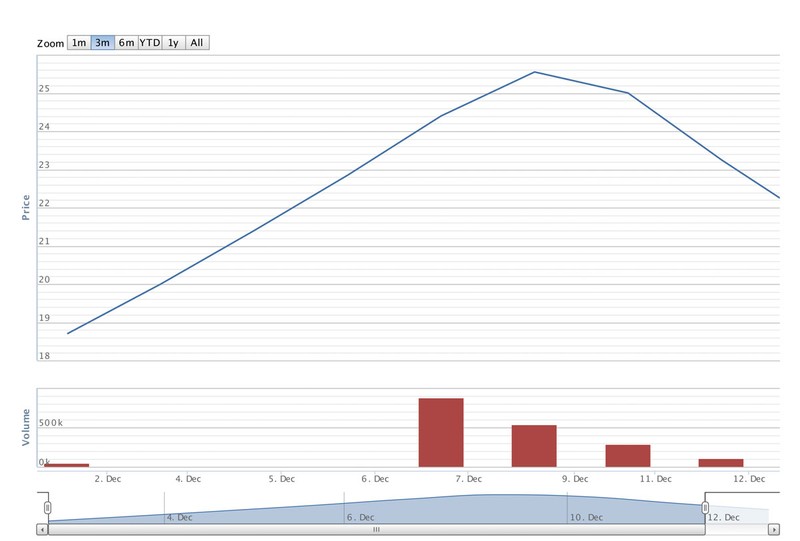 Tuy nhiên, giá của cổ phiếu HVH đang thẳng một mạch đi lên bỗng dưng “đứt gánh giữa đường”. Phiên giao dịch ngày 10/12 chứng kiến mức giảm nhẹ của cổ phiếu này và trong 2 phiên 11 – 12/12, HVH liên tục nằm sàn.