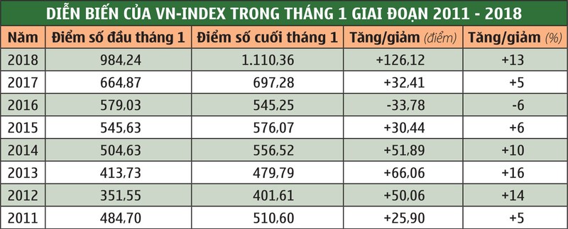“Hiệu ứng tháng Giêng”- hiện tượng giá cổ phiếu thể hiện xu hướng tăng tích cực trong tháng đầu năm đã được kiểm nghiệm tại nhiều TTCK trên thế giới và thể hiện khá đúng tại Việt Nam trong 8 năm qua. Thống kê VN-Index từ năm 2011 đến nay, chỉ số trong tháng Giêng có diễn biến tăng điểm chiếm ưu thế gần như tuyệt đối, 7/8 năm.