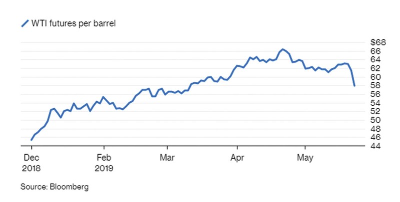Sự lo lắng lan rộng sang cả thị trường dầu mỏ, khi giá dầu đã giảm 13% kể từ mức cao nhất kể từ đầu năm 2019 vừa đạt được vào tháng 4. Giới đầu tư phải đối diện với 2 vấn đề đó là nguồn cung gia tăng tại Mỹ và tăng trưởng kinh tế toàn cầu chậm lại. Theo Bộ Năng lượng Mỹ, sản lượng dầu mỏ dự trữ tại quốc gia này đã lên mức cao nhất trong gần 2 năm qua. Trong khi đó, OECD vừa hạ dự báo tăng trưởng kinh tế toàn cầu năm 2019 xuống còn 3,2%, so với mức 3,3% được đưa ra vào tháng 3.