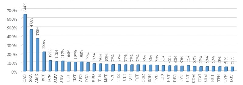 Theo đó, nhiều cổ phiếu vốn hóa lớn tăng giá tốt hồi đầu năm nhưng khó khăn của thị trường chung đã xóa đi toàn bộ thành quả đạt được và chỉ một số ít giữ được đà tăng giá tốt như BVH, VIC, BID… Tuy nhiên, bên cạnh đó, thị trường lại chứng kiến sự bứt phá của nhiều cổ phiếu vừa và nhỏ có kết quả kinh doanh tăng trưởng.