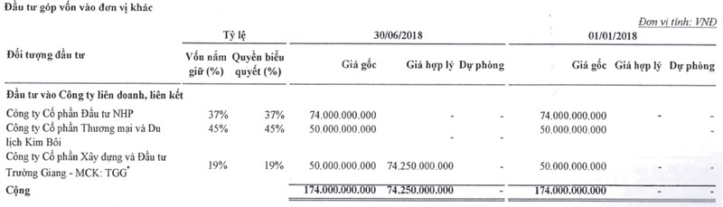 Công ty không thuyết minh chi tiết các khoản mục đầu tư tại Báo cáo tài chính quý III/2018, tuy nhiên tính đến thời điểm báo cáo soát xét quý II/2018 được công bố thì ba khoản đầu tư lớn tại NHP là: Công ty cổ phần Ðầu tư NHP (giá trị đầu tư 74 tỷ đồng, sở hữu 37% vốn), Công ty cổ phần Thương mại và du lịch Kim Bôi (giá trị đầu tư 50 tỷ đồng, sở hữu 45% vốn), Công ty cổ phần Xây dựng và đầu tư Trường Giang (giá trị đầu tư 62,8 tỷ đồng, sở hữu 24% vốn). Như vậy tổng số vốn đang đầu tư tại những công ty này lên tới 187 tỷ đồng.