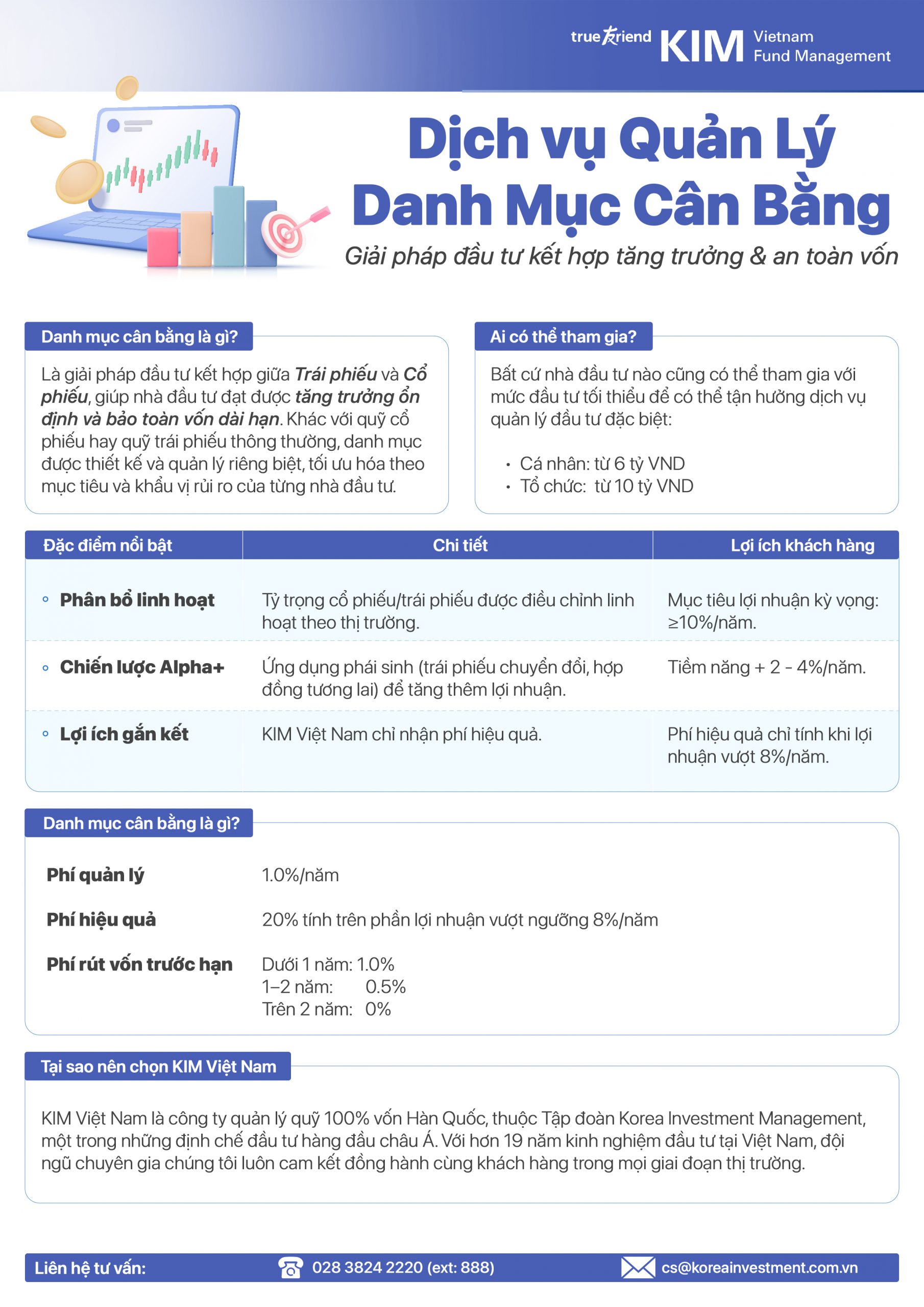 KIM Vietnam Fund Management – thành viên của Korea Investment Management Co., Ltd, mang đến giải pháp đầu tư Danh mục Cân Bằng giúp nhà đầu tư tối ưu lợi nhuận và bảo toàn vốn trong dài hạn. Đây là giải pháp đầu tư thông minh kết hợp giữa cổ phiếu và trái phiếu, mang đến hiệu quả bền vững và lợi nhuận kỳ vọng trên 10%/năm.