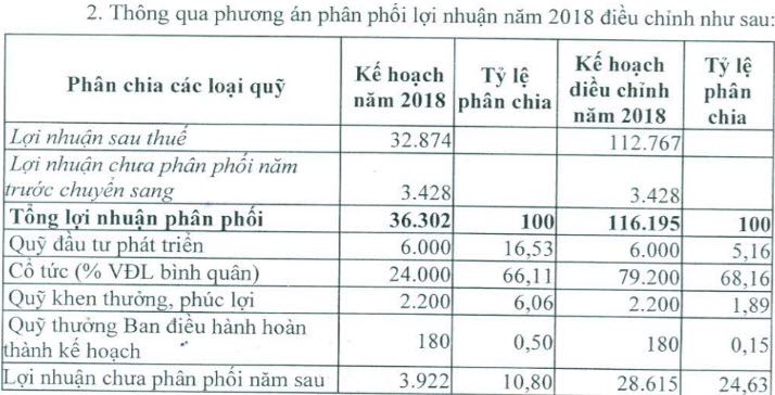 Với kế hoạch lãi tăng mạnh, MH3 cũng điều chỉnh phương án phân phối lợi nhuận. Trong đó, đáng chú ý là việc điều chỉnh giá trị chia cổ tức từ mức 24 tỷ đồng (tỷ lệ 20%) lên 79,2 tỷ đồng (tỷ lệ 66%) và lợi nhuận còn lại chuyển sang năm sau cũng tăng mạnh.