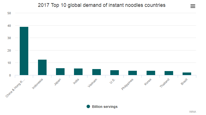 Globally, some 100 billion servings of instant noodles were sold in 2017, an average of 270 million packages consumed per day.