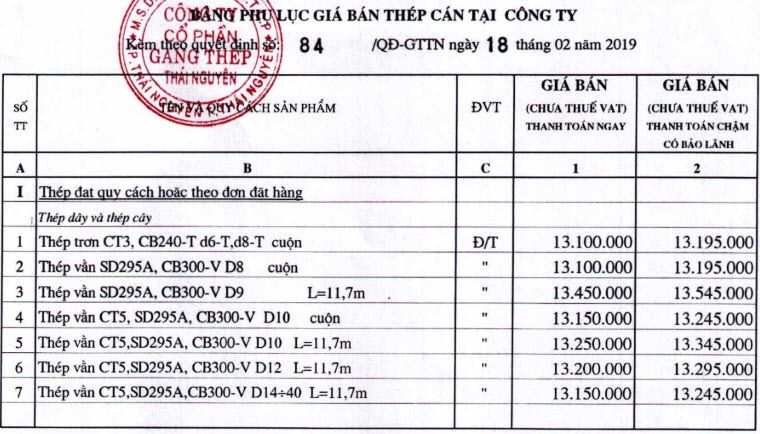 Công ty CP Gang thép Thái Nguyên (Tisco) ngày 18/2 cũng nâng giá thép thành phẩm. Trong đó, thép thanh vằn D10 tăng 200.000 đồng/tấn, thép cuộn, D12 và D14 trở lên tăng 150.000 đồng/tấn. Giá các sản phẩm thép xây dựng dự án các loại cũng tăng 150.000 đồng/tấn. Đây là lần tăng giá thứ 4 của công ty kể từ cuối tháng 12 năm ngoái. Trong vòng chưa đầy 2 tháng, giá thép trơn tăng 600.000 đồng/tấn từ 12,5 triệu đồng/tấn lên 13,1 triệu đồng/tấn (chưa VAT) trong khi thép vằn tăng từ 12,85 triệu đồng/tấn lên 13,45 triệu đồng/tấn (chưa VAT).