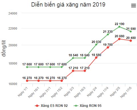 Sau điều chỉnh, giá bán mới xăng E5 RON 92 tối đa 21.599 đồng một lít, xăng RON 95 20.488 đồng.