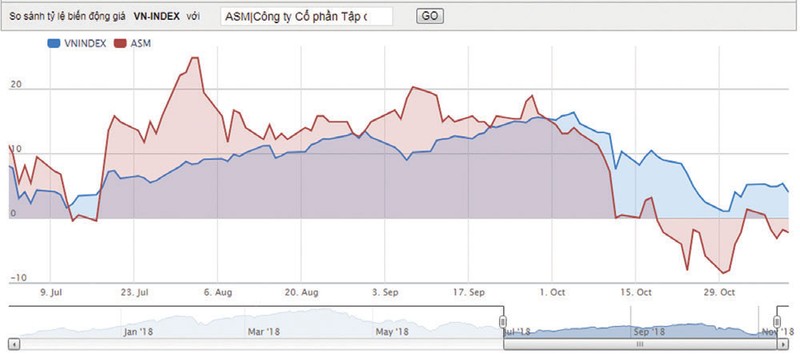 Cuối quý I, tín hiệu lợi nhuận tăng trưởng “thần kỳ” đã tạo động lực cho cổ phiếu ASM. Mã chứng khoán này bắt đầu giai đoạn tăng từ cuối tháng 3/2018 từ mức khoảng 11.000 đồng/cổ phiếu lên mức đỉnh hơn 10 tháng là 15.150 đồng/cổ phiếu. Sau khi rơi về vùng giá cũ theo đà giảm chung của thị trường vào giữa tháng 7, ASM có nhiều phiên tăng giá liên tiếp đi liền sau đó lại là 3 – 4 phiên giảm giá.