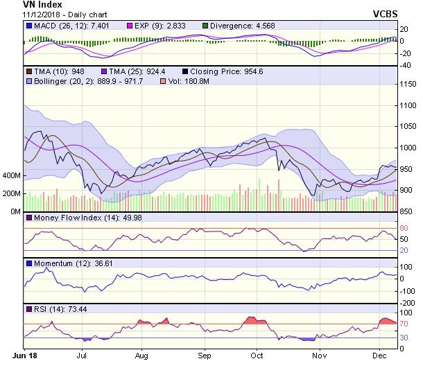 Dự báo, trong phiên giao dịch 12/12, VN-Index có thể sẽ có phiên thứ 7 liên tiếp giằng co và rung lắc trong biên độ 950-960 điểm trước khi bứt phá hẳn khỏi vùng này.