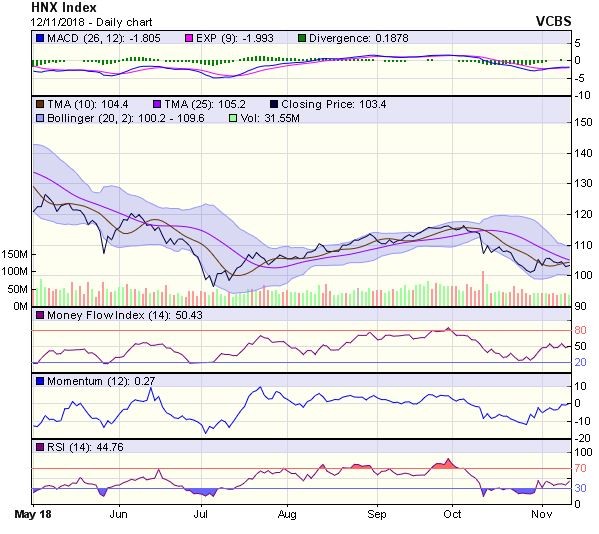 HNX-Index có diễn biến tương tự. Mặc dù, chỉ số có phiên tăng điểm trở lại nhưng vẫn duy trì đóng cửa dưới MA5 và 20, cho thấy xu hướng chính trong ngắn hạn vẫn là giảm điểm, phiên tăng điểm vừa qua có thể chỉ mang tính kỹ thuật.