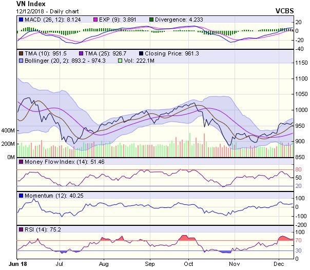Dự báo, trong phiên giao dịch 13/12, VN-Index có thể sẽ tiếp tục tăng điểm với mục tiêu là khoảng giá 970-990 điểm tương ứng với gap down trước đó giữa 2 phiên 10/10 và 11/10.