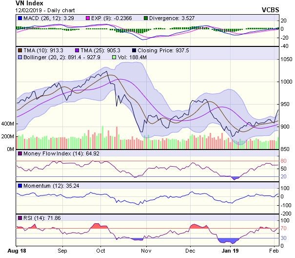 Tuy nhiên, việc đường giá bứt phá khỏi kênh giá đi ngang kéo dài trong những tuần trước tết được kỳ vọng sẽ mở ra một xu hướng biến động mới theo hướng tăng điểm cho thị trường, với đích đến nằm tại 950-960 điểm trong ngắn hạn.