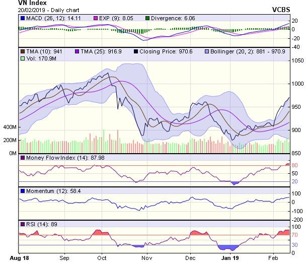 VN-Index tăng 0,65% lên 970,58 điểm. Đà tăng của thị trường được duy trì trong suốt phiên giao dịch nhưng đan xen vào đó là các nhịp rung lắc trong phiên.