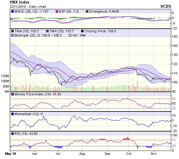 HNX-Index có diễn biến tương tự. Chỉ số có phiên tăng điểm và duy trì đóng cửa trên MA20, kèm theo MA5 cho tính hiệu cắt lên MA20 hàm ý xu hướng phục hồi ngắn hạn đang quay trở lại, chỉ số có thể tiến lên thử thách vùng kháng cự quanh 105.7 điểm (đỉnh tháng 11/2018).