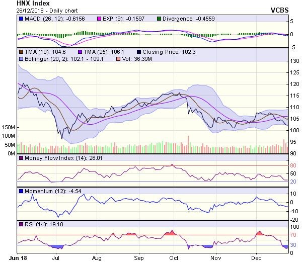 Chỉ số có phiên giảm điểm thứ tư liên tiếp và duy trì đóng cửa dưới đường MA20, cho thấy xu hướng giảm vẫn đang tiếp diễn, chỉ số có thể tiếp tục đi xuống thử thách vùng hỗ trợ tâm lý 100 điểm trong những phiên tới.