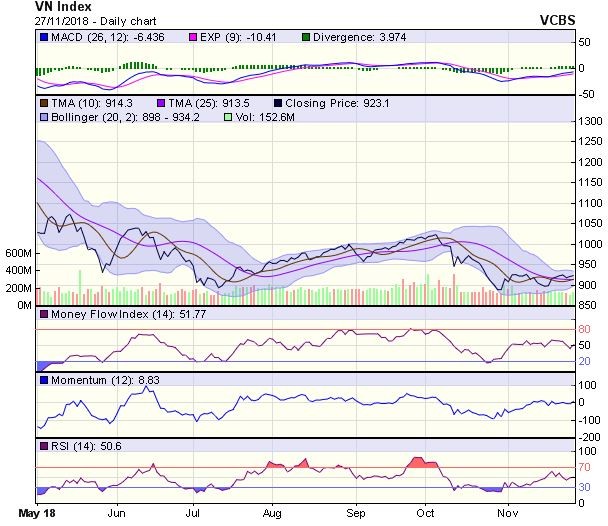 Dự báo, trong phiên giao dịch 28/11, VN-Index có thể sẽ tiếp tục giằng co và đi ngang trong biên độ 900-930 điểm với thanh khoản thấp.