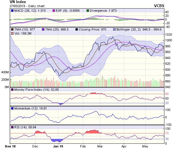 Trên khung đồ thị ngày, chỉ số phục hồi sau khi chạm đường SMA20 và đường trên của đường kênh giá đi xuống sau khi xuyên phá lên trên kênh này vào ngày 16/5 và điều chỉnh trong 4 phiên liên tiếp từ ngày 21/5