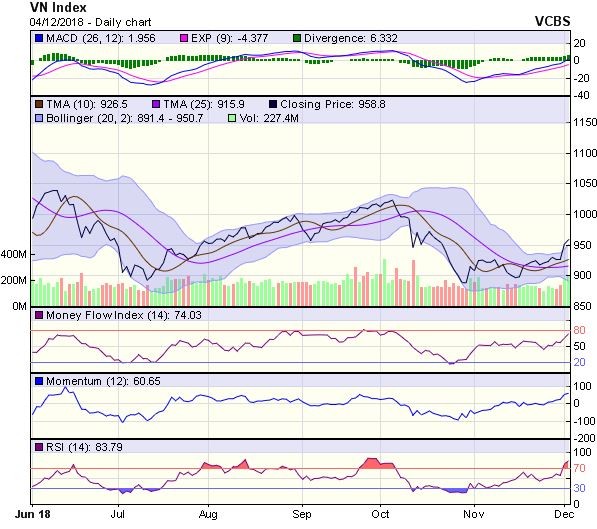 VN-Index tăng 0,76% lên 958,84 điểm. Thị trường tiếp tục duy trì đà tăng trong hầu hết phiên giao dịch. Dù có xuất hiện các nhịp điều chỉnh trong phiên nhưng cường độ tăng của chỉ số vẫn có xu hướng mạnh dần về cuối phiên.
