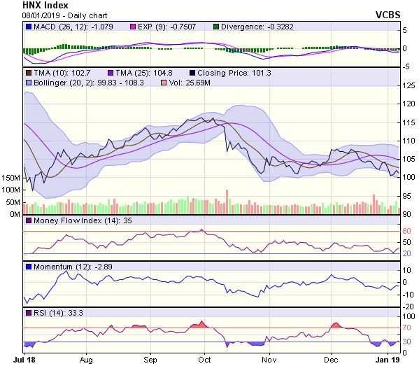 HNX-Index có diễn biến tương tự. Chỉ số cũng có phiên giảm trở lại và duy trì dưới MA20, cho thấy xu hướng chính vẫn là giảm điểm, ngưỡng hỗ trợ gần có thể là vùng tâm lý 100 điểm.
