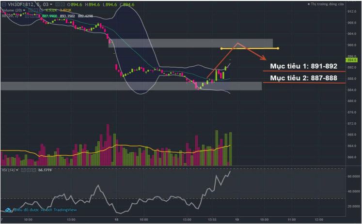 Lực nâng đỡ từ vị thế Mua có thể thấy là khá mạnh khiến xu hướng giảm trong phiên không rõ ràng, lực mua vào mạnh nhất sau khi HĐTL 1812 chạm ngưỡng cản dưới của vùng cản 882-887, đây là vùng khối lượng giao dịch tích lũy khá dày được ghi nhận kể từ cuối tháng 11. Với các chỉ báo năm tiệm cận vùng quá mua vào cuối phiên 18/12, dự báo phiên giao dịch ngày 19 sẽ có thể vấp phải điều chỉnh nhẹ sau khi chạm ngưỡng điểm 897,8. Sau đó giá sẽ di chuyển theo diễn biến của chỉ số cơ sở rất chặt chẽ do gần sát ngày đáo hạn.