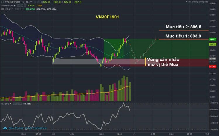 Do ngày 20/12 là phiên đáo hạn của HĐTL 1812, có thể thấy rõ sự dịch chuyển của khối lượng giao dịch giữa 2 loại hợp đồng 1812 và 1901, các vị thế mở trong khuyến nghị cũng được dựa vào HĐTL 1901. Các chỉ báo kỹ thuật cho thấy đà giảm điểm của HĐTL 1901 cũng không còn nhiều, dư địa giảm có thể chỉ chạm vùng 877,2-879,7 sau đó sẽ rung lắc và hồi phục trở lại trong phiên giao dịch ngày 21/12. Tuy nhiên, với mức premium hiện có, kỳ vọng hồi phục ở mức trung bình, do đó cân nhắc không nên mở full vị thế.