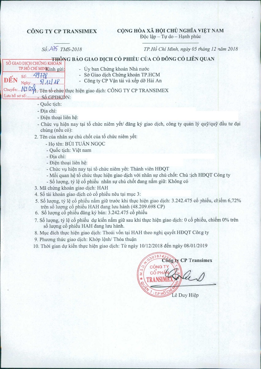 CTCP Transimex thông báo giao dịch cổ phiếu của tổ chức có liên quan đến người nội bộ Công ty Cổ phần Vận tải và Xếp dỡ Hải An như sau: