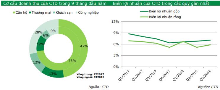 Với Cotecons, công ty đạt doanh thu thuần 9 tháng 20.737 tỷ đồng, tăng 14% so với cùng kỳ 2017, tương đương 74% kế hoạch năm. Tỷ trọng doanh thu từ mảng xây lắp căn hộ giảm mạnh so với cùng kỳ năm trước, từ mức 73% xuống 47% trên tổng doanh thu do chính sách thay đổi khiến cho nhiều chủ đầu tư chưa hoàn thiện thủ tục pháp lý để triển khai các dự án căn hộ thương mại. Tuy nhiên, tỷ trọng doanh thu từ mảng xây lắp khu công nghiệp tăng mạnh từ 9% lên 28% trên tổng doanh thu trong 9T2018 do lo ngại chiến tranh thương mại Mỹ-Trung khiến nhiều doanh nghiệp sản xuất tại Trung Quốc phải di dời nhà máy sang các nước có chi phí nhân công và hàng rào thuế quan thấp hơn trong đó có Việt Nam.