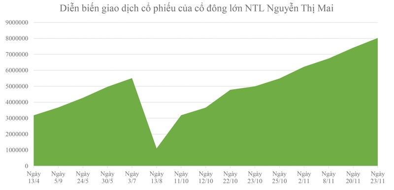 Bà Nguyễn Thị Mai trở thành cổ đông lớn của NTL từ ngày 13/4/2018 và sau đó liên tục mua thêm cổ phiếu. Tuy nhiên, tới ngày 13/8/2018, bà Mai bán gần hết cổ phiếu, chỉ còn lại hơn 1,82%. Giá cổ phiếu NTL trong giai đoạn này không có nhiều biến động, do vậy, nếu tính về việc đầu tư tài chính, khoản lợi nhuận mà bà Mai đạt được từ những giao dịch này không đáng kể.