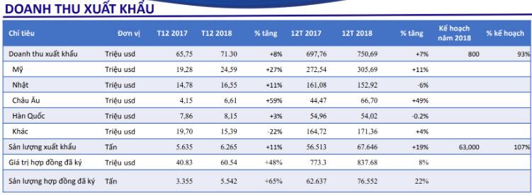Tính riêng tháng 12, công ty xuất khẩu được 5.635 tấn sản phẩm và ghi nhận mức doanh thu 65,75 triệu USD. Trong đó, Mỹ là thị trường lớn nhất với 19,28 triệu USD, chiếm tỷ trọng 29,3%.