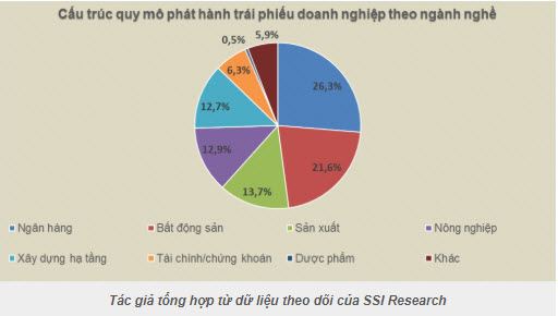 Xét về quy mô phát hành, ngành ngân hàng chiếm tỉ trọng cao nhất với 26,7%, tiếp theo đó là bất động sản (21,6%), sản xuất (13,8%), nông nghiệp (12,9%) và xây dựng (12,7%).
