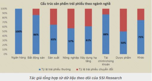 Phân theo ngành nghề và tính trên các đợt phát hành, ngành ngân hàng có 100% các sản phẩm trái phiếu là trái phiếu thường, tỉ lệ này tại các ngành bất động sản, tài chính/chứng khoán, sản xuất lần lượt là 86,4%, 87,5%, 64,7%.
