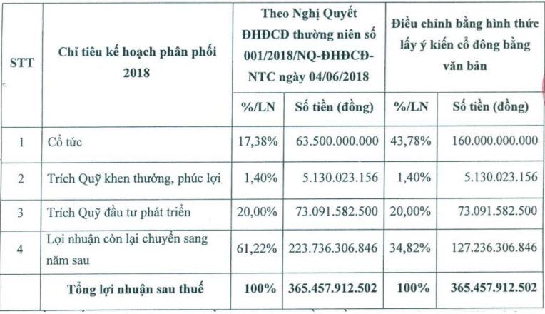 Với việc lấy ý kiến thay đổi kế hoạch phân phối lợi nhuận năm 2018 như trên, NTC cũng lấy ý kiến thông qua tạm ứng cổ tức năm 2018 bằng tiền với tỷ lệ chi trả 100% (1 cổ phiếu được nhận 10.000 đồng).
