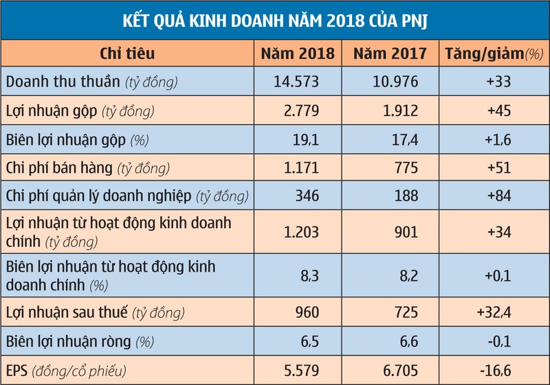 Tính tới thời điểm cuối tháng 11/2018, PNJ có tổng cộng 317 cửa hàng, tăng 48 cửa hàng so với đầu năm. Tốc độ tăng doanh thu trên mỗi cửa hàng đạt 12,7%, trong khi tốc độ tăng số lượng cửa hàng là 17,8%. Tốc độ tăng lợi nhuận sau thuế trên mỗi cửa hàng đạt 12,3%. Năm 2017, lợi nhuận sau thuế bình quân 1 cửa hàng của PNJ đạt 2,7 tỷ đồng và tăng lên 3 tỷ đồng vào năm 2018.