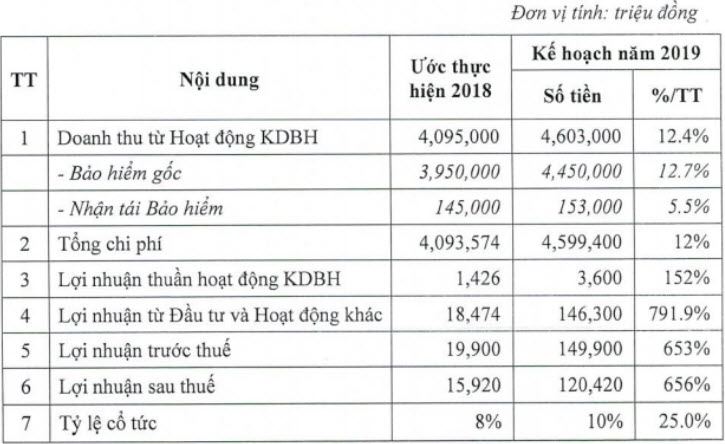Cổ tức năm 2019 dự kiến sẽ tăng lên 10%. Kế hoạch kinh doanh năm 2019 đề ra là lãi sau thuế 120,42 tỷ đồng, gấp 7,5 lần thực hiện năm nay nhưng giảm 19% so với kế hoạch đề ra đầu năm.