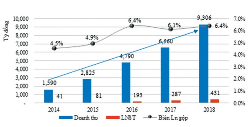 Trong giai đoạn 2014-2018, doanh thu của Ricons đã tăng 5,9 lần, từ 1.590 tỷ đồng năm 2014 lên 9.305,5 tỷ đồng năm 2018, tương ứng với mức tăng bình quân 55,5%/năm. Quy mô doanh thu tăng đi kèm với giá trị các khoản phải thu cũng tăng theo, tuy nhiên, mức độ tăng trưởng của khoản phải thu lại nhanh hơn khá nhiều so với doanh thu.