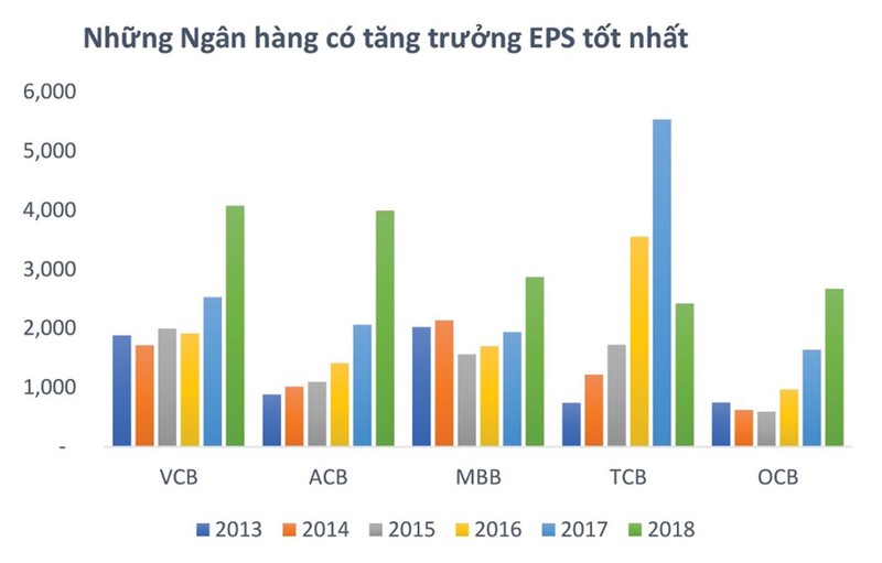 Thu nhập trên mỗi cổ phần (EPS) trung bình của 18 ngân hàng niêm yết năm 2018 đạt hơn 2.300 đồng, trong đó VCB, ACB là hai ngân hàng có EPS gần 4.000 đồng. Nhóm ngân hàng đạt EPS quanh 3.000 đồng có MBB, VPB, HDB, OCB, VIB.