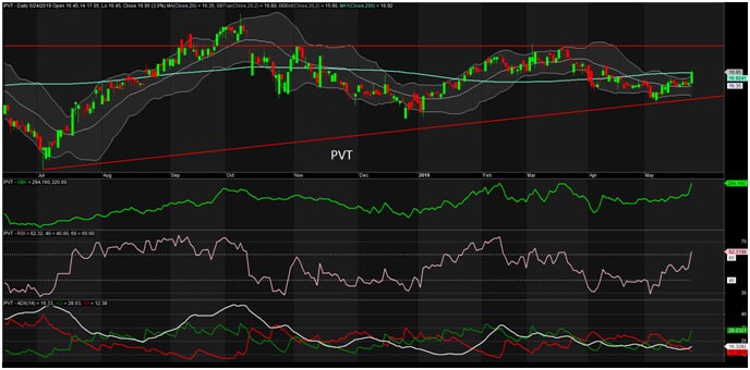 PVT đã có 7 phiên tích lũy trong vùng giá hẹp trước khi bứt phá với khối lượng giao dịch đột biến phiên cuối tuần 24/5 bất chấp thị trường giảm mạnh. PVT có phiên bứt phá khá giống GMD phiên hôm 17/5.