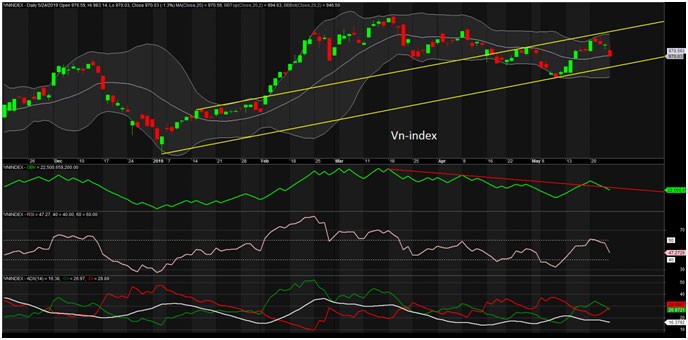Diễn biến trong phiên cho thấy áp lức cắt lỗ tăng lên đáng kể khi chỉ số không giữ được mốc 980 điểm. Các trụ bị bán quá mạnh, tới 2/3 số mã trong VN30 giảm mạnh thì rất khó để VN-Index không giảm sâu. Tuy nhiên, cầu bắt đáy vẫn xuất hiện ở những vùng hỗ trợ mạnh kéo thanh khoản tăng đáng kể so với phiên hôm 23/5. Việc đóng cửa ở mức thấp nhất ngày cho khả năng cao là chỉ số sẽ dò đáy kênh (như đồ thì) trong ngắn hạn. Ngưỡng hỗ trợ tiếp theo tầm 960 điểm.