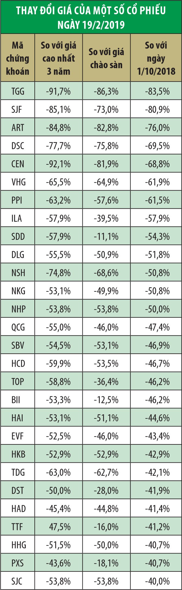 Thống kê sơ bộ, trong quý IV/2018, có hơn 160 cổ phiếu có mức giảm giá trên 13%, lớn hơn mức giảm của VN-Index. Trong đó, 98 mã giảm trên 20%, với quá nửa số mã giảm trên 30%. Sau Tết Nguyên đán đến nay, thị trường tăng điểm, nhưng vẫn có không ít mã giảm trên 40% trong giai đoạn 1/10/2018 – 19/2/2019, mức giảm lớn hơn nhiều khi so với mức đỉnh trong vòng 3 năm và giá ngày chào sàn.