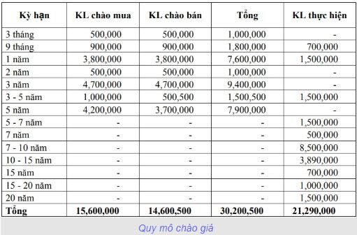 Giao dịch trong ngày được thực hiện tại các kỳ hạn 9 tháng, 1 năm, 3-5 năm, 5-7 năm, 7 năm, 7-10 năm, 10-15 năm, 15 năm, 15-20 năm và 20 năm, với tổng khối lượng thực hiện đạt 21,29 triệu trái phiếu.