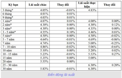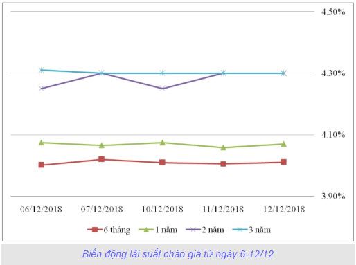 Trong phiên giao dịch ngày 12/12/2018, lãi suất chào tại các kỳ hạn 6 tháng, 9 tháng, 1 năm và 3-5 năm tăng từ 1 đến 10 điểm cơ bản so với phiên gần nhất. Lãi suất chào tại các kỳ hạn 2 năm, 3 năm, 5 năm, 10 năm, 15 năm và 20 năm không thay đổi so với phiên gần nhất. Lãi suất chào tại các kỳ hạn còn lại giảm từ 1 đến 2 điểm cơ bản so với phiên gần nhất.