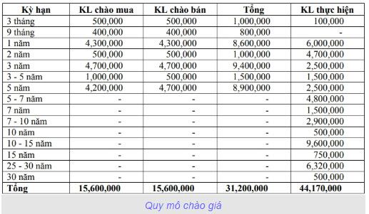 Giao dịch trong ngày được thực hiện tại các kỳ hạn 3 tháng, 1 năm, 2 năm, 3 năm, 3-5 năm, 5 năm, 5-7 năm, 7 năm, 7-10 năm, 10 năm, 10-15 năm, 15 năm, 25-30 năm và 30 năm với tổng khối lượng thực hiện đạt hơn 44,17 triệu trái phiếu.