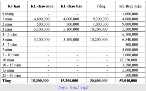 Giao dịch trong ngày được thực hiện tại các kỳ hạn 9 tháng, 1 năm, 2 năm, 3 năm, 3-5 năm, 5 năm, 5-7 năm, 7 năm, 7-10 năm, 10 năm, 10-15 năm, 15 năm và 25-30 năm, với tổng khối lượng thực hiện đạt 59,04 triệu trái phiếu.