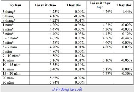 Lãi suất thực hiện tại các kỳ hạn 3 tháng, 1 năm, 2 năm, 3 năm, 3-5 năm, 5 năm, 10 năm và 15-20 năm giảm 2 đến 144 điểm cơ bản so với phiên gần nhất. Lãi suất thực hiện tại kỳ hạn 5-7 năm tăng 2 điểm cơ bản so với phiên gần nhất. Lãi suất thực hiện tại kỳ hạn 15 năm không đổi so với phiên giao dịch gần nhất.